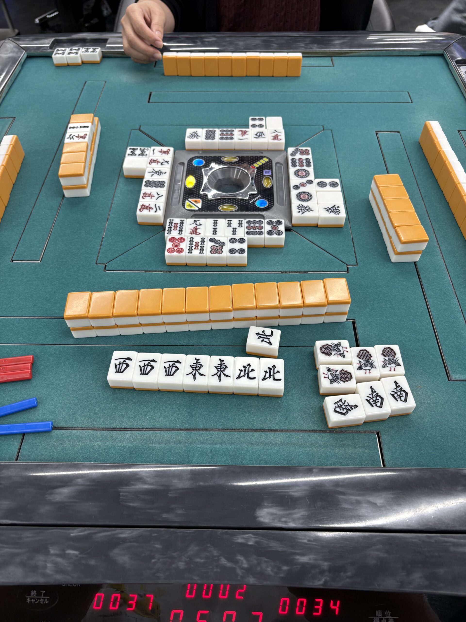 東発の親番を迎え意気揚々と第一打を打つと、南家の方がすぐに「ツモ。」の発声。地和を親かぶりする展開に。
