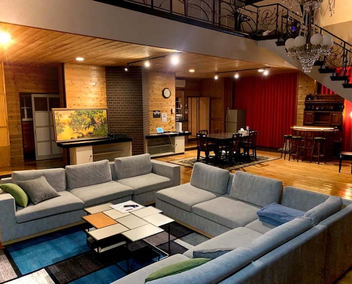 キッチンも風呂も広く、談笑できるスペースも多くて、バーカウンターもあり、カラオケもオッケーなことから、軽音楽サークルの合宿で使いそうな満足な設備です。